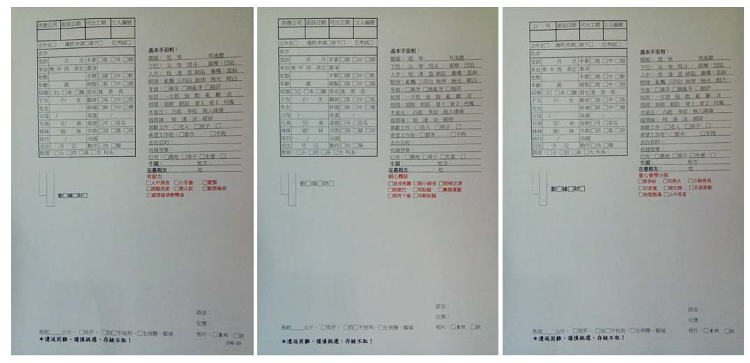 - 同時而也必須透過手面相之觀察檢視,對工人之基本個性進行評估:是否溫順服從?與人相處愉快?人際關係好?會自我要求約束?勤勞?是否知道應儲蓄會規劃未來?有無犯罪及背叛逃逸之傾向……等。